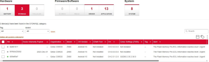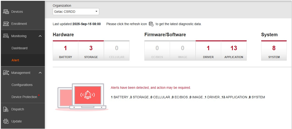 Getac Monitoring automatically collects data from the client devices and conducts data analysis according to the preset threshold values. When a device component reaches the threshold, it will be added to the alert list.