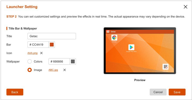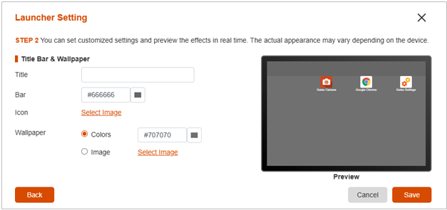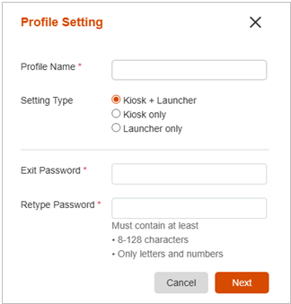Depending on the Setting Type you selected, continue with the setting instructions as described in the “Kiosk Setting Details” and “Launcher Setting Details” below.