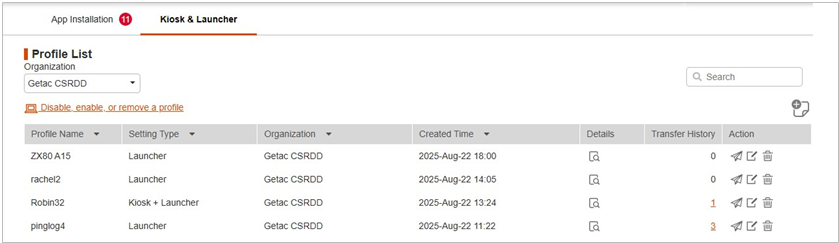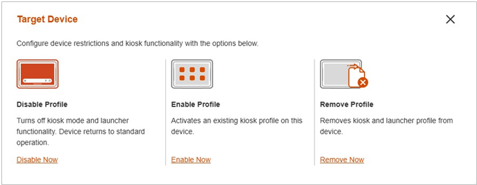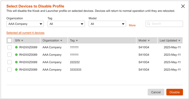 Click Disable Now in the popup window. You will see the list of devices with the Kiosk and/or Launcher profile applied.