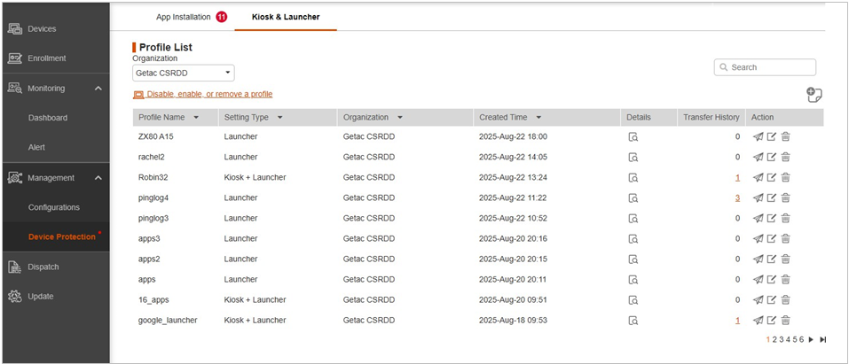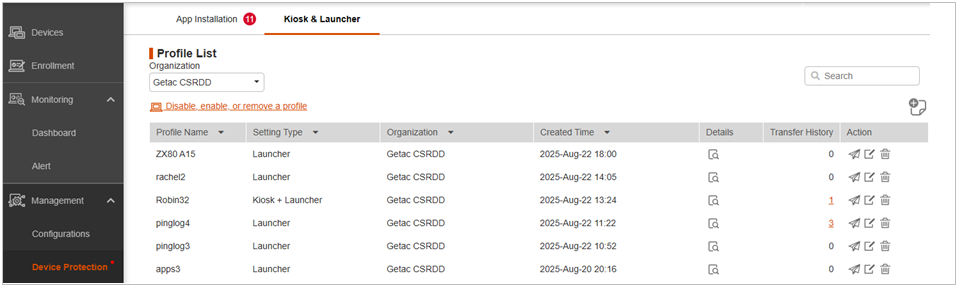 Select Device Protection and then the Kiosk & Launcher tab. You will see the list of profiles which have been created.