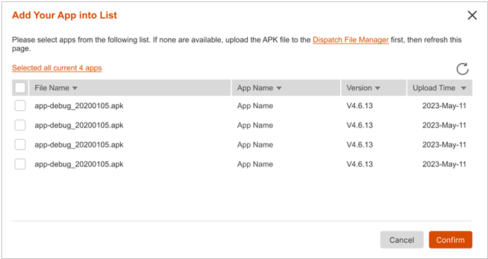 The apps listed here are those which have been uploaded to the server using the Dispatch – File Manager function. If you have not yet uploaded the app, you can click the link Dispatch File Manager in this popup window to go to the function. (See “File Manager” for information.)