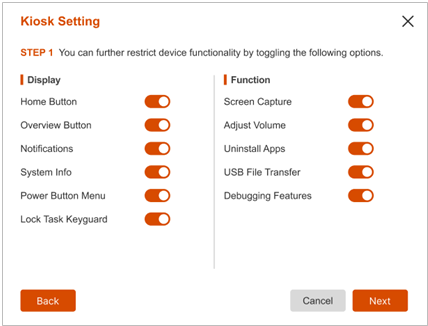 In the Kiosk Setting popup window, slide the switch for an item on or off as needed. Click Next to continue.