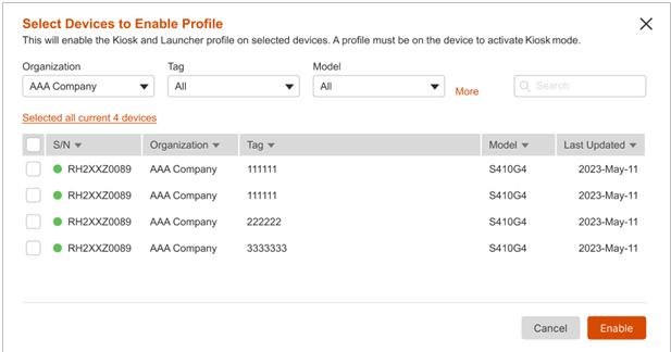 Click Enable Now in the popup window. You will see the list of devices with the Kiosk and/or Launcher profile.