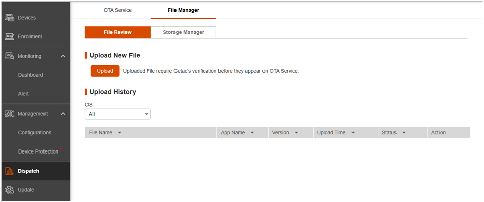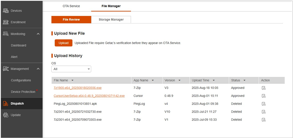 The file will be verified by Getac. Once verified, you will see the Approved status in the Upload History list.