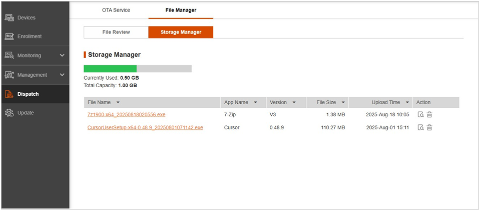 The purchase order(s) for the same company is given a certain amount of storage space in the Getac server for storing installation package files. You can free the space by deleting files no longer needed.